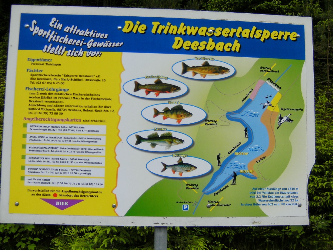 Bei der Mündung des Dessbachs (jetzt bitte nicht an die Dimensionen der Elbmündung o.ä. denken) ist die Tafel mit den Hinweisen für Angler zusehen.