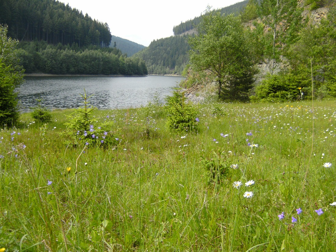Am Ende der Vorsperre um 180 Grad abbiegen und den Speicher Dessbach jetzt auf der anderen Seiten Flussabwärts folgen.