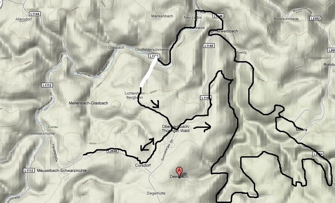 Durch Cursdorf Richtung Meuselbach, 200 Meter hinter den Ortsausgang auf den Feldweg in der gleichen Richtung abbiegen,