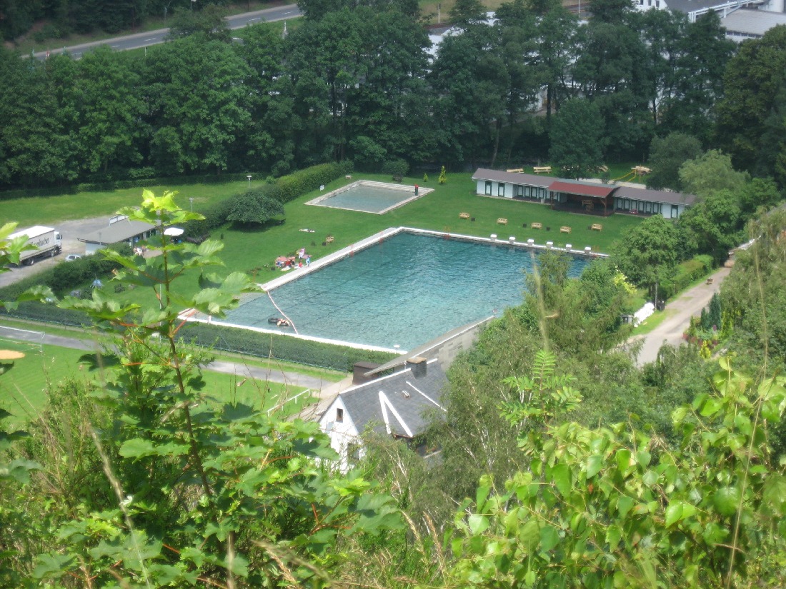 Mellenbacher Schwimmbad vom Steinbruch aus gesehen.