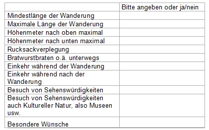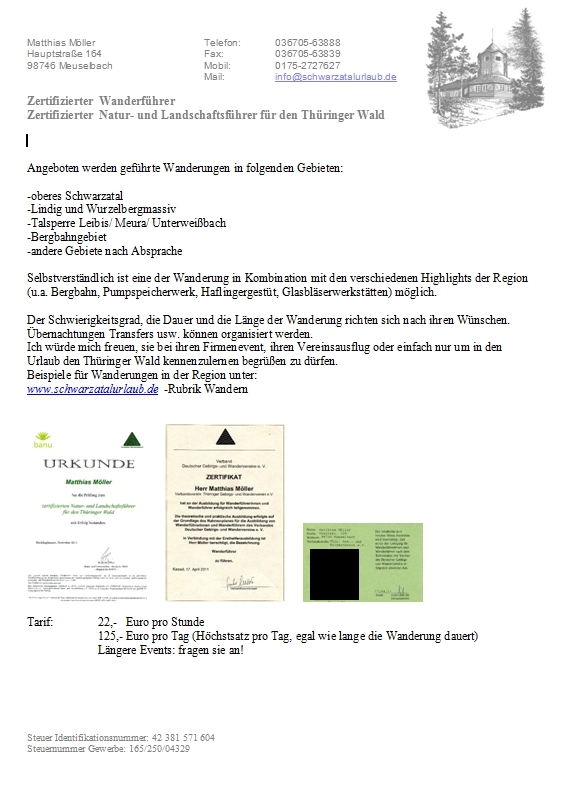 Ich biete ihnen auch geführte Wanderung an. Als Zertifizierter Wanderführer erfolgt dies natürlich nach dem beim Deutschen Gebirgs- und Wanderverein e.V. geltenden Richtlinien. Die Wanderungen werden individuell nach ihren Wünschen zusammengestellt. Gerne auch für Vereine und Wandergruppen. Zusätzliche Übernachtungsmöglichkeiten werden bei Bedarf mit Angeboten. Die Touren können leichte Spaziergänge bis hin zu mittelschweren Wanderungen beinhalten. Der Rennsteig ist in unmittelbarer Nähe, aber auch im oberen Schwarzatal oder auf den vielen Hochflächen mit herrlichen Panoramablicken sind viele interessante Routen möglich. Die Verpflegung kann aus dem Rucksack sein, aber auch das Bratwurstbraten auf einen Rastplatz oder die Einkehr in einer gebietstypischen Gaststätte ist eine mögliche Variante. Bei Interesse bitte melden.Um ihre Wünsche besser berücksichtigen zu können hier einige Kriterien für ihre geplante Wanderung zum Ausfüllen oder einfach anrufen.