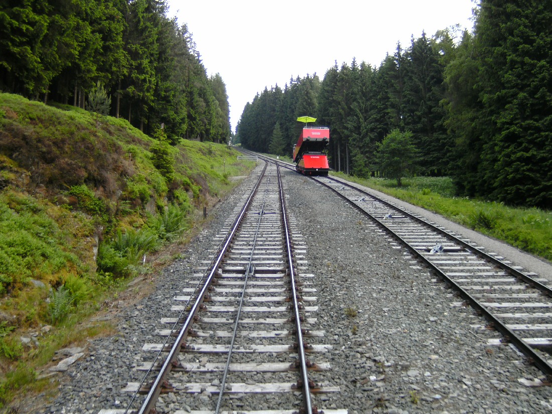 Der entgegenkommende so genannte Bock mit dem offenen Panoramawagen (bzw. geschlossener Wagen bei schlechten Wetter) fährt in der Regel auf dem zweiten Gleis, so das es zu keinem Zusammenstoß kommen sollte.Vom Bahnhof Lichtenhain 200 meter paralell der Gleise bis zur Straße. Dort beginnt 30 Meter unterhalb des Bahnübergangs ein Weg, diesen entlang der Schienen (3 Km) bis Cursdorf folgen, oder den Triebwagen auf der Flachstrecke nutzen.