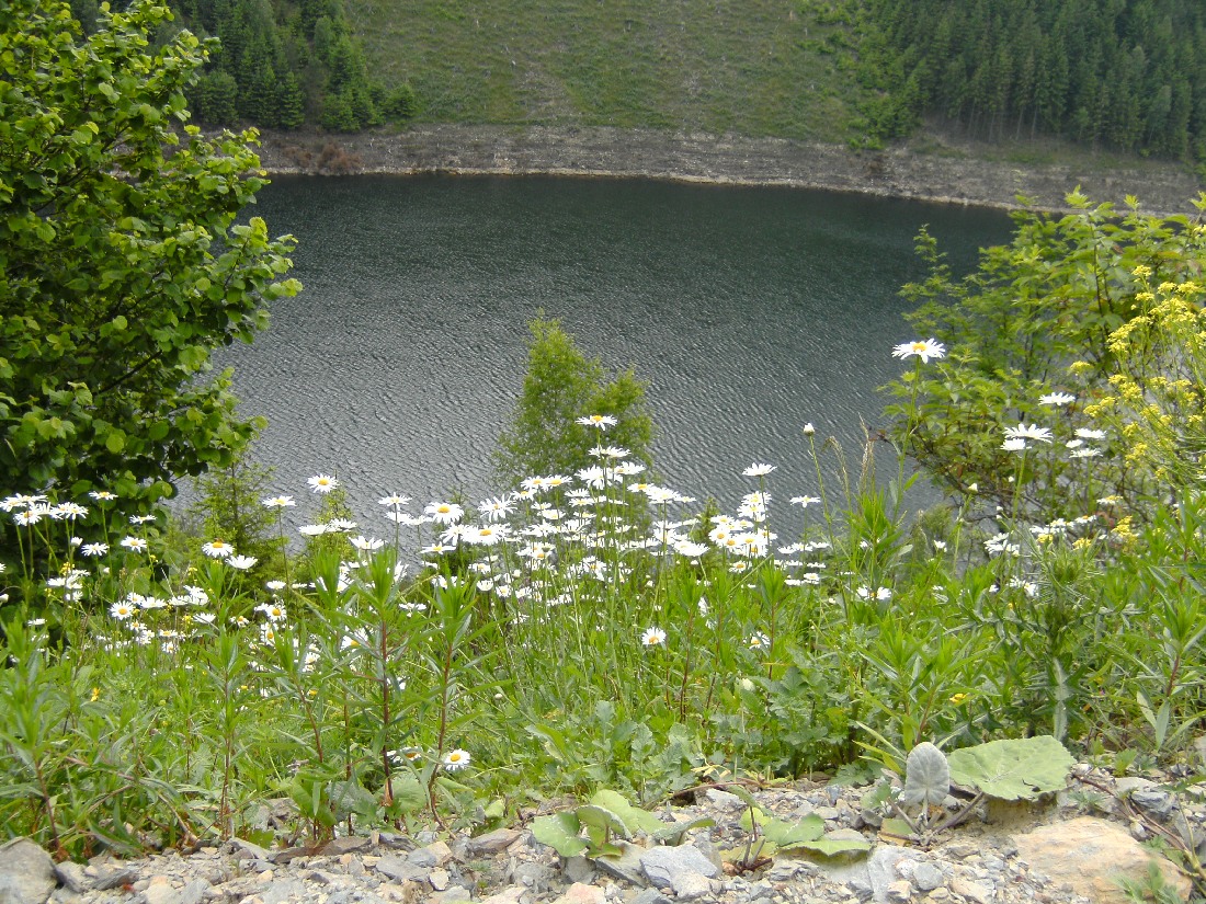 Danach dieselbe Strecke wieder einen Km zurück, und dann der asphaltierten Straße bis zur Staumauer folgen. Hierzu an der Schutzhütte (von oben gesehen) rechts abbiegen.