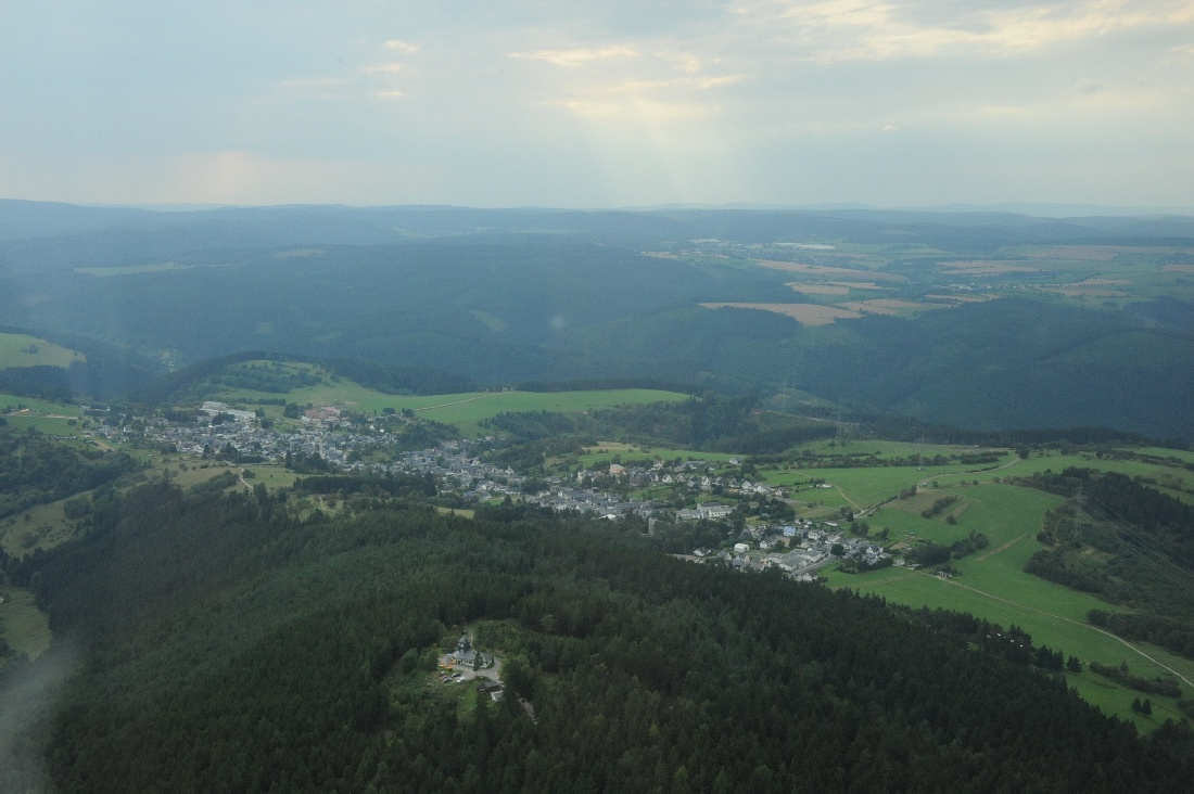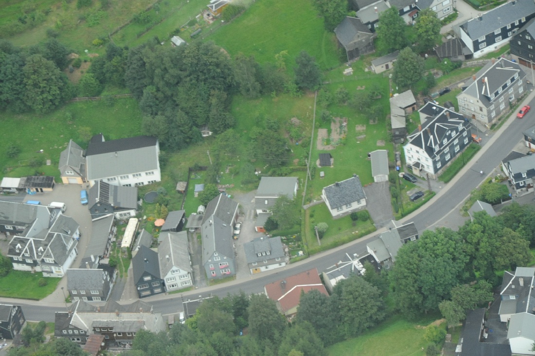 Luftbild von Meuselbach-Schwarzmühle, Ortsteil Meuselbach im Vordergrund der "heilige Berg" die Meuselbacher Kuppe mit Gastätte. Zum vergrößern anklicken.