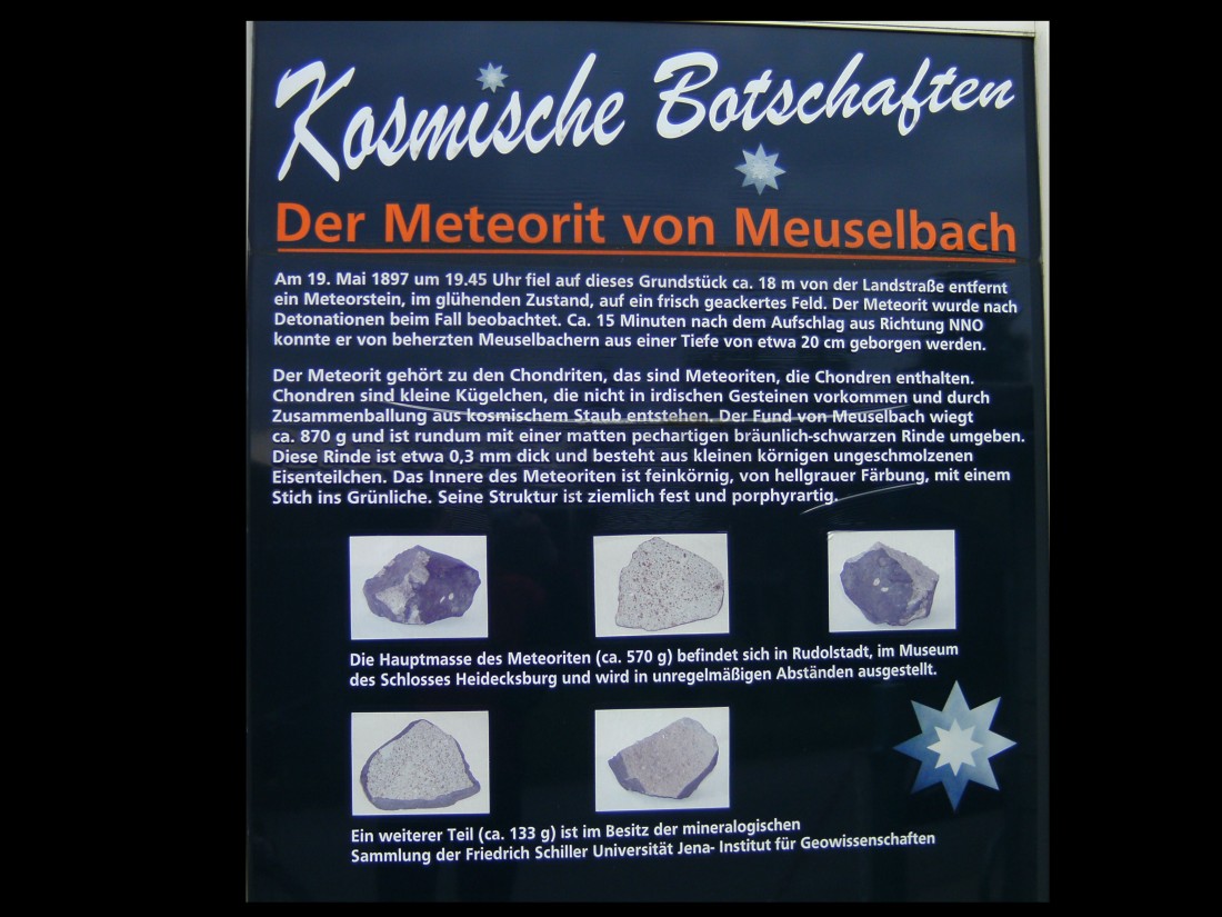 Kurz vor den Ort ist die Stelle, wo im Mai 1887 der berühmte Meuselbacher Meteorit eingeschlagen hat. Eine Informationstafel erinnert daran.