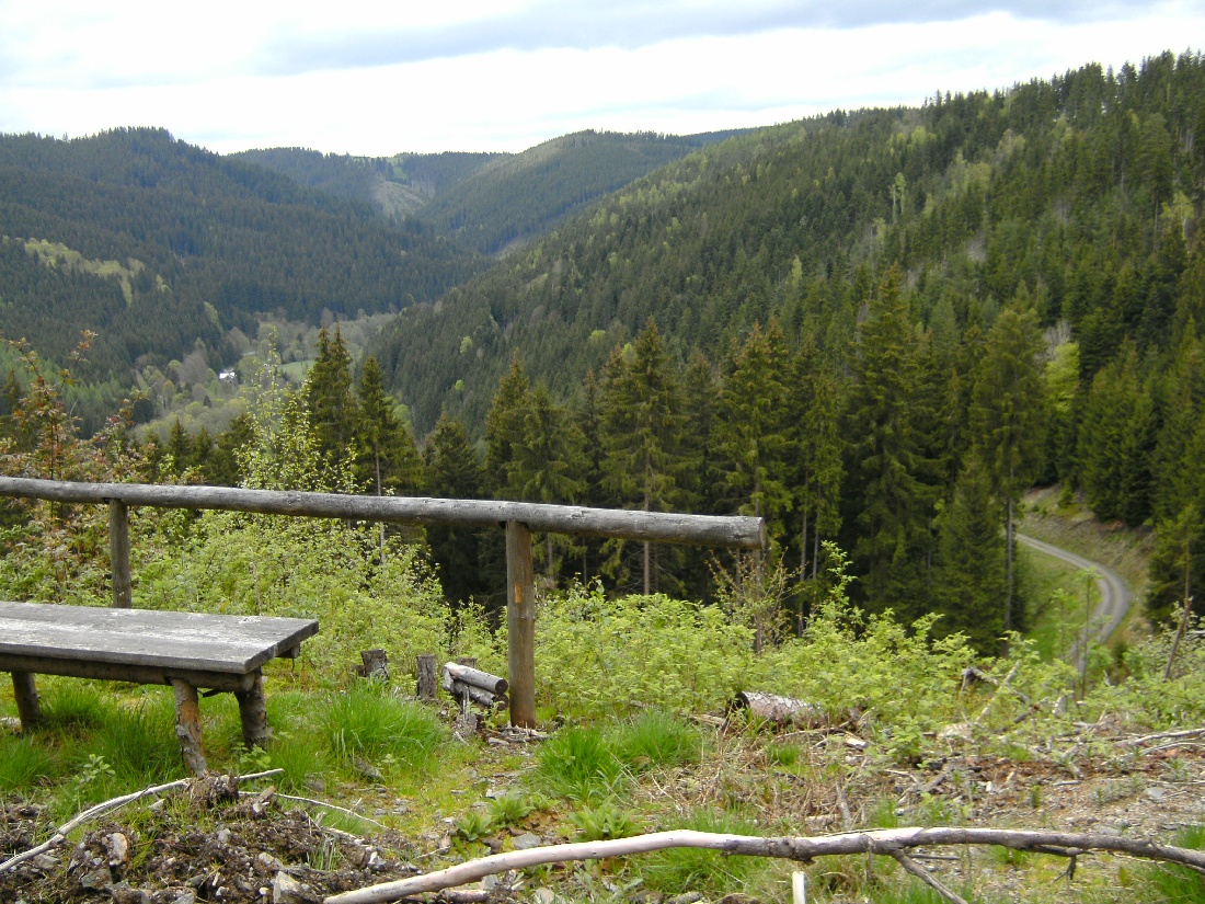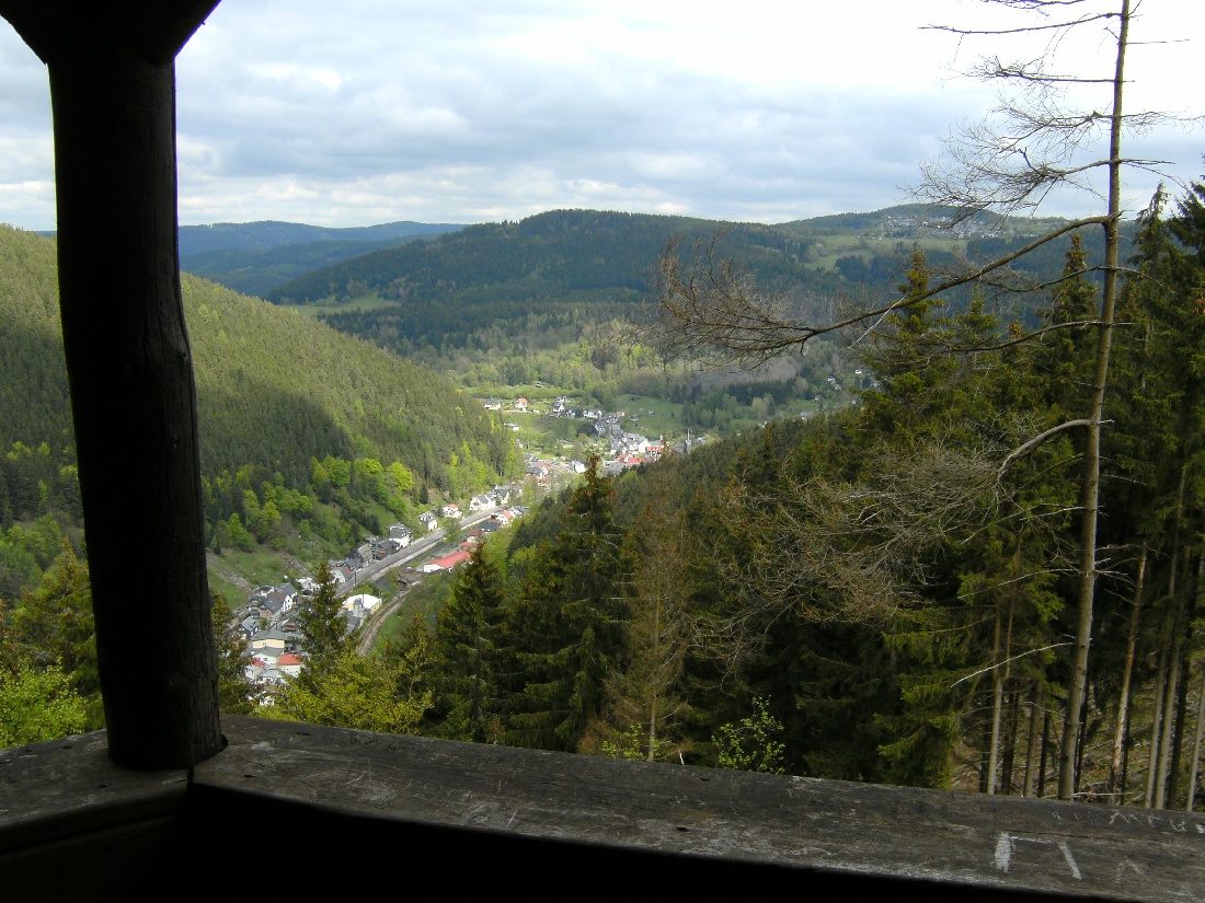 Beim Ende des neu gebauten Forstweges ist eine Wendeschleife. An dieser Stelle rechts abbiegen. Jetzt ist vorn links ein Funkmast zu sehen. Unmittelbar daneben ist die Schutzhütte/Aussichtspunkt Borkenhäuschen. Von hier ist Mellenbach und dahinter auf dem Berg Lichthain zu sehen.
