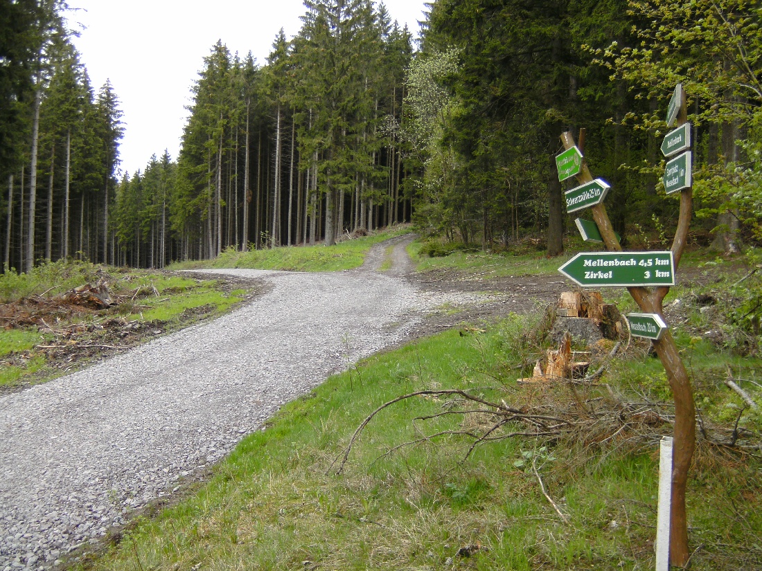 An der Abzeigung Zirkel/Mellenbach dieser nicht folgen, sondern den leicht links abbiegenden neuen Forstweg folgen.